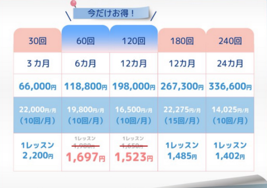 割引キャンペーン中(10レッスンプレゼント)の値段です。