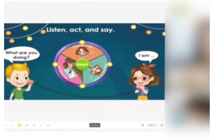 ↑はルーレットで当たった単語(listening, reading,など現在進行系の動詞)をI am ___ の空白部分の当てはめて発語させているところです。